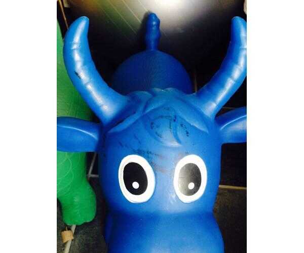 . Blå ko og grøn dinosaurer. Brugsspor, fx aftegn i koens hovede. 30 kr på stk.