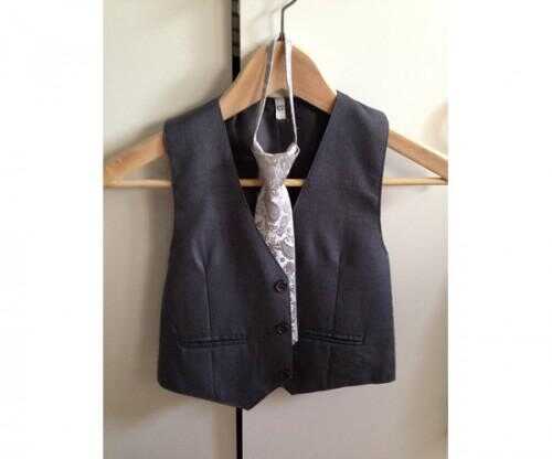 Jakkesæt, Vest sæt , Ukendt, fra Tyskland, str. 74 Sæt i gråt nåle-drenge-strib bestående af: Vest Hvid bomuldsskjorte Bukser (med elastik i talje) Slips 70% polyester og 30% viscose Særdeles velegnet til barnedåben eller til andre festlige lejlighed