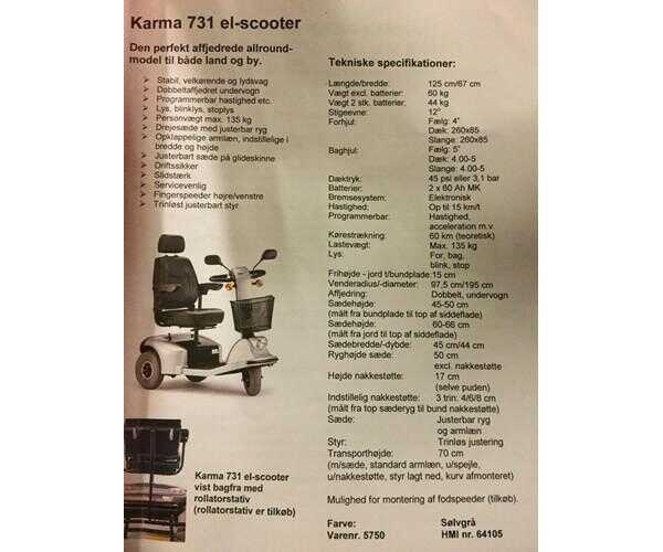 Elscooter, BEK Karma 737 SOM NY . har kørt max 10 km ,2år gl , stadig 1 års garanti Min mor brækkede ryggen 1 mrd efter hun købte den , den har altid stået i hendes stue og er blevet opladet jævnligt , står som spritny , ingen Brugsmærker , hverken p
