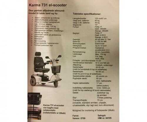 Elscooter, karma Karma 737-2 El-scooter flot og ny serviceret med nyere batterier . meget velholdt, står som ny, 2013 model. kan ses og afprøves stabil, velkørende og lydsvag affjedret undervogn programmerbar hastighed etc. lys, blinklys, stoplys per