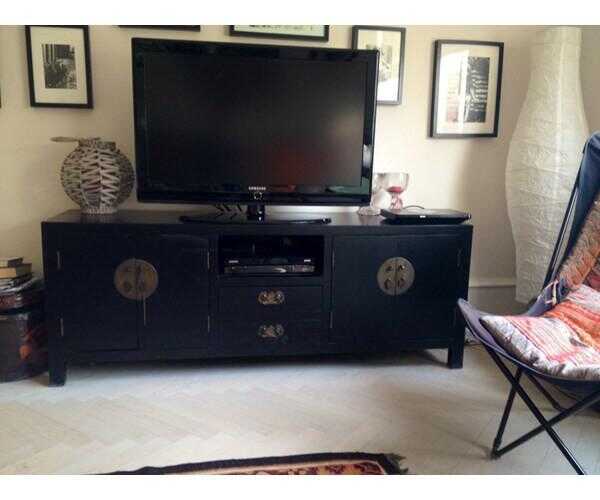 Andet produkt, b: 104 d: 40 h: 90 Flot kinesisk møbel/skab med fantastisk flotte dekorationer på guld baggrund. Bag lågerne er der hylder og øverst en stor anvendelig skuffe med filt. Grundet særlige omstændigheder har det aldrig været i brug. Det sæ