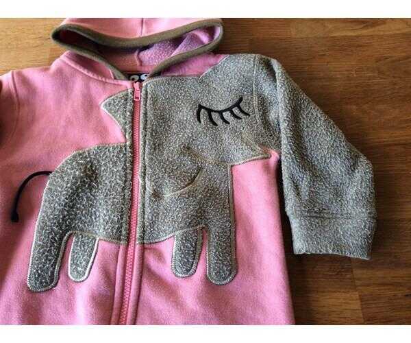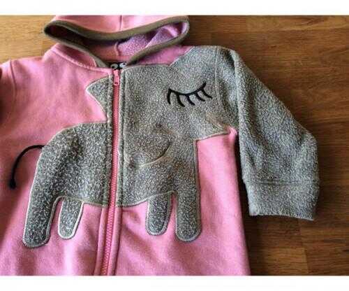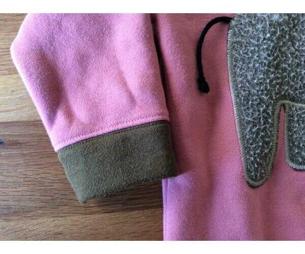 Farven er lyserød med motiv af grå elefant på brystet, venstre arm agerer elefantens snabel.