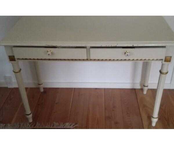 Hvidlakeret skrivebord med 2 skuffer og diverse udsmykninger med bl.a påført bladguld.