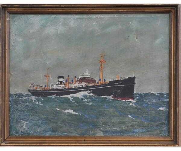 Oliemaleri, P.Petersen, motiv: Andet, stil: Naturalistisk, b: 66 h: 45 Skoleskibet København, som gik ned med mand og mus d 22/12 1928, og 60 personer mistede livet. Der er aldrig fundet rester fra skibet.Type: Oliemaleri Stilart: Naturalistisk Kunst