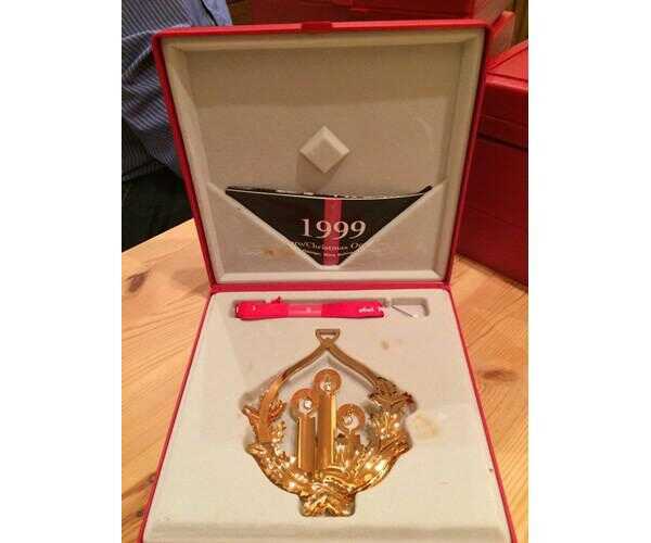 Georg Jensen forgyldte Ornamenter/Ophæng Georg Jensen forgyldte Juleophæng/Ornamenter Pris 100,- pr. stk. - 2 Pak 180,- 1990 Hjerte 1990 Stjerne 1991 Fugl 1992 Tromme - 110,- 1992 Kringle - 110,- 1993 Julebuk - 110,- 1994 Juleklokke - 110,- 1995 Kræm