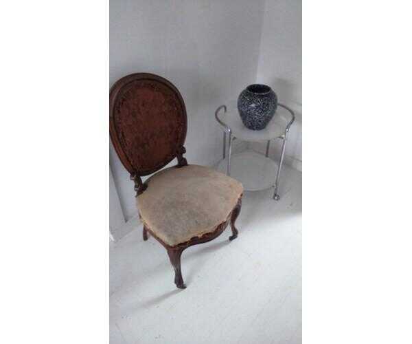 To rokokostole til ompolstring, eller som de er til det rå, industrielle look. Meget stabile, behagelige at sidde på. 53 cm brede, siddehøjde 45. 200/stk, eller begge stole samlet for 300.